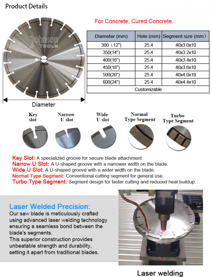 2. İyi Verimlilik ile Kürlenmiş Beton için 500mm Elmas Turbo Testere Bıçağının Teknik Özellik Bilgileri